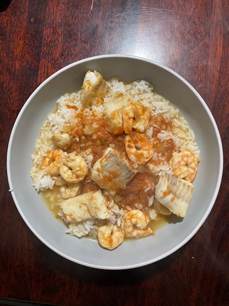 Michigan’s blustery spring weather put us in the mood for a warm pot of soup. I’ve done a chicken soup with salsa before and thought I’d try it with seafood.
