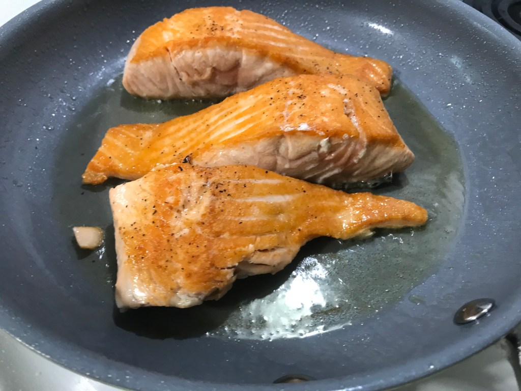 - Heat oil in a large skillet over medium-high heat. Season salmon with salt, pepper, and garlic powder all over. Sear in the hot pan, flesh-side down first, for 5 minutes on each side, or until cooked to your liking. Once cooked, remove from the pan and set aside.