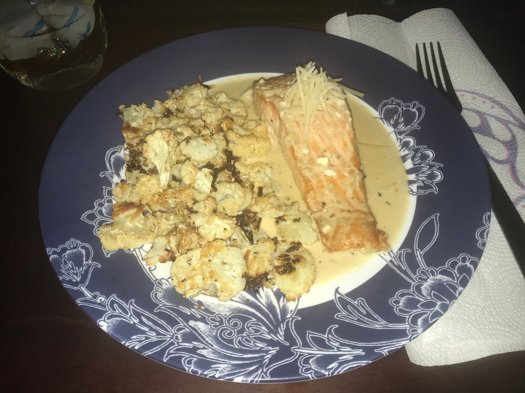 I added 2 oz of cream cheese into the sauce to make it even more thick and cheesy. I also roasted some cauliflower as a side dish and seasoned it with salt, pepper, and shredded parmesan cheese.