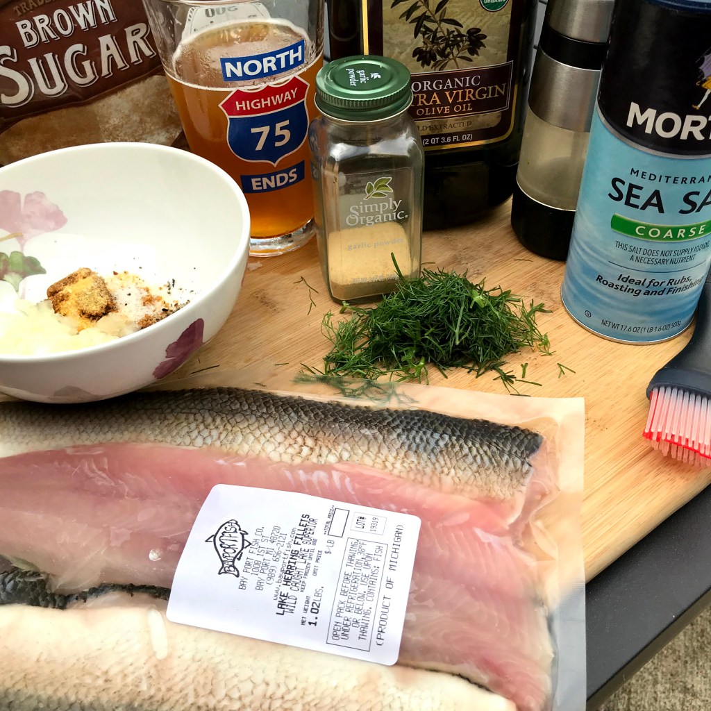 His recipe uses rainbow trout, and I substituted the lake herring/cisco from Bay Port Fish Co. The recipe calls for a rub made with brown sugar. I typically avoid adding sugar to my main dish (I prefer to save it for dessert), but I decided to give it a try. In addition, Titus’s rub calls for onion powder (I substituted chopped onion), garlic powder, salt, pepper, and smoked paprika. Check out Titus’s post on Eat Wisconsin Fish for the full recipe.