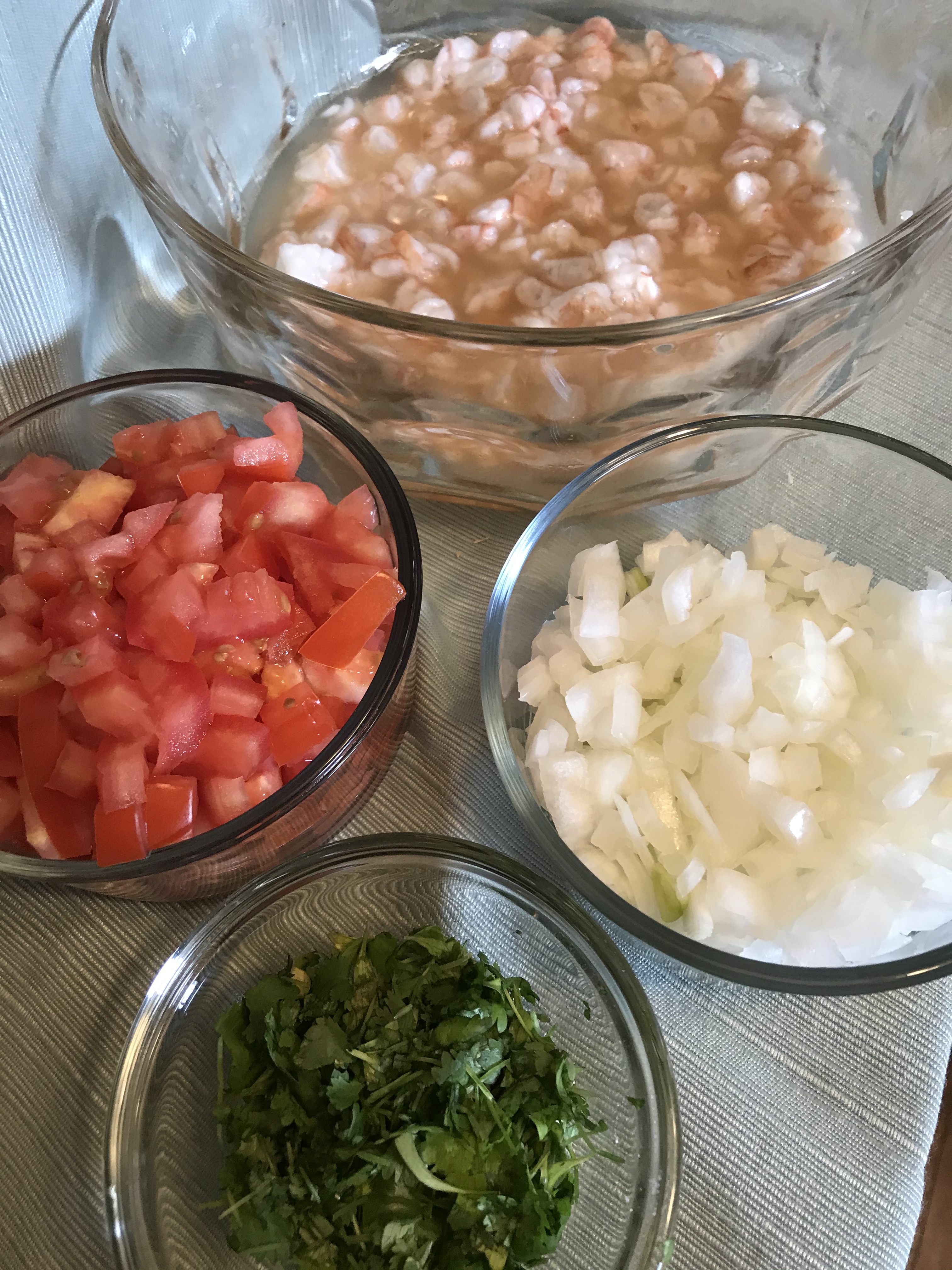 The recipe itself is easy peasy – just lots of dicing and slicing and then tossing it all together. The acid in the lime juice “cooks” the shrimp so they’re safe to eat. I’m a spice wimp so I did NOT add the hot sauce. But it was a delicious dish just the same.