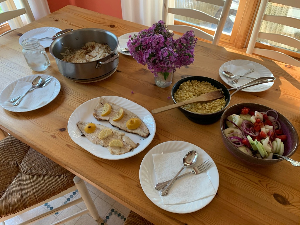 - Plate your meal and enjoy! Once the meat is cooked, and the skin side touching the grill is crisped, you can remove your fillet from the grill, plate the fillet, and round out with any side dishes to complement your fish dinner for the evening. Here we round our plate with a cucumber salad, rice pilaf, and canned corn.